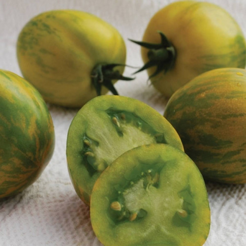 Green Zebra is an open pollinated/heirloom tomato producing 3–4 oz. globe-shaped fruits. Ripe fruit develops a yellow blush over dark green stripes, offering a distinct tangy flavor.